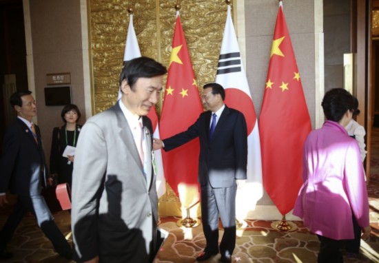 韓國(guó)總統(tǒng)樸槿惠對(duì)李克強(qiáng)總理表示:"韓中日三國(guó)合作有利于地區(qū)和平穩(wěn)定。要引導(dǎo)日本抱著正確的歷史觀,為東北亞和平做出貢獻(xiàn)。"