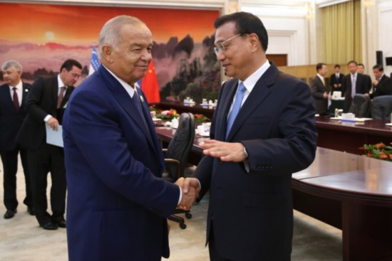 李克強(qiáng)總理會(huì)見(jiàn)烏茲別克斯坦總統(tǒng)卡里莫夫時(shí)說(shuō):"中烏可以在雙方感興趣的領(lǐng)域廣泛開(kāi)展產(chǎn)能和裝備制造業(yè)合作。"